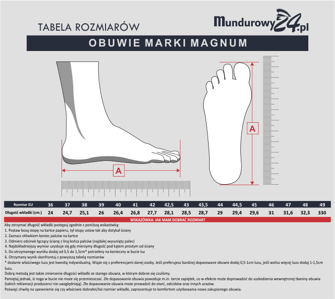 Tabela rozmiarów: OBUWIA TAKTYCZNEGO MAGNUM